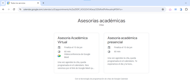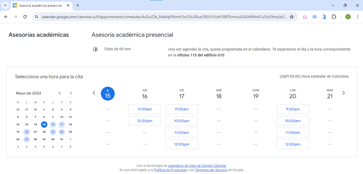 De esta manera la asesoría quedará registrada en tu calendario académico; te esperamos el día y hora seleccionada, de manera virtual (en el link de meet que aparece en el calendario) o en la oficina 115 ubicada en el nuevo edificio de la Facultad (antes IGAC - 610), primer piso, costado derecho.