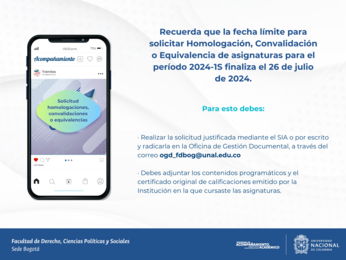 Recuerda que la fecha límite para solicitar Homologación, Convalidación o Equivalencia de asignaturas para el período 2024-1S finaliza el 26 de Julio de 2024.