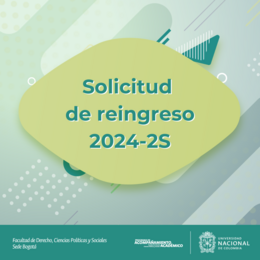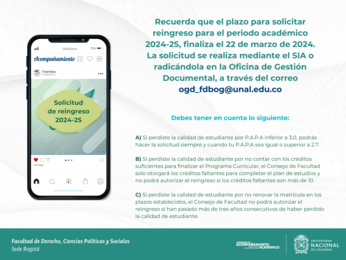 Recuerda que el plazo para solicitar reingreso para el periodo académico 2024-2S, finaliza el 22 de marzo de 2024. La solicitud se realiza mediante el SIA o radicándola en la Oficina de Gestión Documental, a través del correo ogd_fdbog@unal.edu.co.