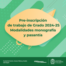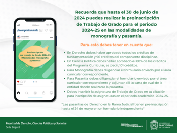 Recuerda que hasta el 30 de junio de 2024 puedes realizar la preinscripción de Trabajo de Grado para el periodo 2024-2S en las modalidades de monografía y pasantía.
