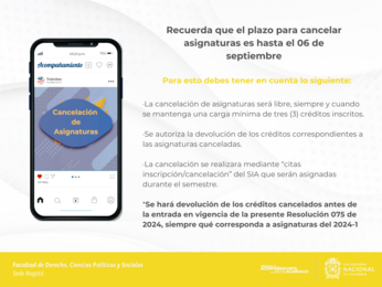 Recuerda que el plazo para solicitar la cancelación de asignaturas es hasta el 06 de septiembre de 2024. Para esto debes tener en cuenta lo siguiente: