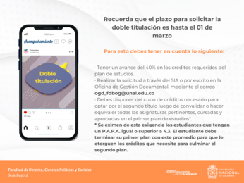 Recuerda que el plazo para solicitar la doble titulación es hasta el 01 de marzo de 2024. Para esto debes tener en cuenta lo siguiente: